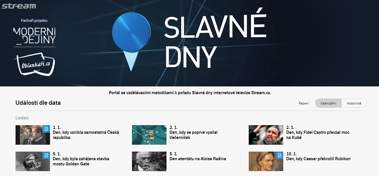 - https://dejiny.ceskatelevize.cz/ – web samotného pořadu s obsahuje křížovky a kratší hry, které dokáží vtáhnout mladší žáky. Nevýhodou je web založený na Flashi, což může být u nového Chrome složitější co se týče ovládání a složité skrolování v jednotlivých událostech.