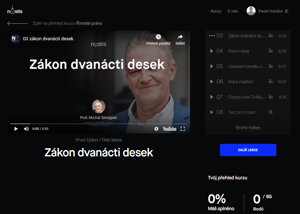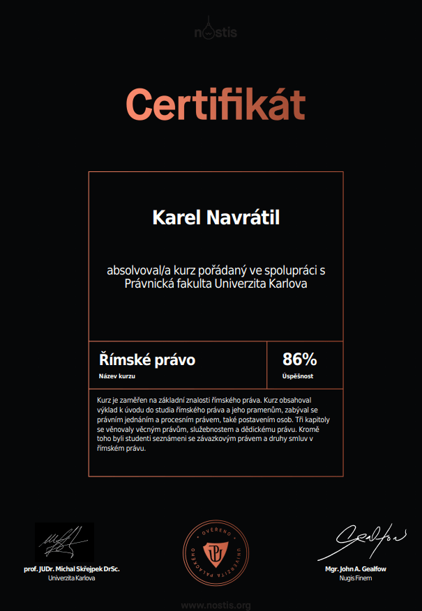 Platforma Nostis nabízí bezplatné kurzy právního povědomí, které připravuje v spolupráci s právními fakultami univerzit. Kurzy jsou strukturované do týdenních bloků plných video přednášek, textů a jiných materiálů (např. myšlenkových map). Na konci každého z bloků si vyplníte test, a po získání daného množství bodů získáte certifikát o úspěšném absolvování kurzu.
